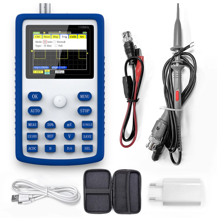 FNIRSI-1C15 представляет собой отличную портативную модель с частотным диапазоном 110MHZ. Осциллограф работает от встроенного аккумулятора, имеет полный комплект для работы, функцию самокалибровки, генератор сигнала для проверки щупов (1кГц), защитный силиконовый чехол и сумку для переноски и хранения.