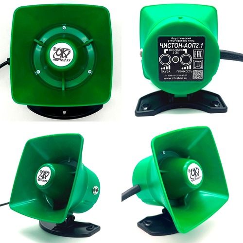 Отпугиватель птиц «ЧИСТОН-АОП 2.1» представляет собой автономную систему, предназначенную для защиты территорий от всех видов птиц, наносящих урон сельскому хозяйству и животноводству. Кроме того, изделие может быть использовано в городах, там, где скопление птиц является источником повышенного шума или несет угрозу отделке и кровле зданий, памятников культуры и архитектуры. Принцип действия акустических отпугивателей серии «ЧИСТОН-АОП» основан на естественной реакции птиц и других животных на звуковые сигналы тревоги сородичей и голоса хищных птиц. Воспроизведение этих звуков не вредит птицам, но вызывает у них инстинктивный страх и вынуждает улетать с защищаемой территории. Устройство воспроизводит предварительно записанные фрагменты звуков опасности для птиц с высокой громкостью в диапазоне акустической прозрачности местности характерной для средней полосы России. Громкость, периоды повторения звуковых файлов и алгоритмы работы прибора от времени суток регулируются а также дублируются голосовыми оповещениями.