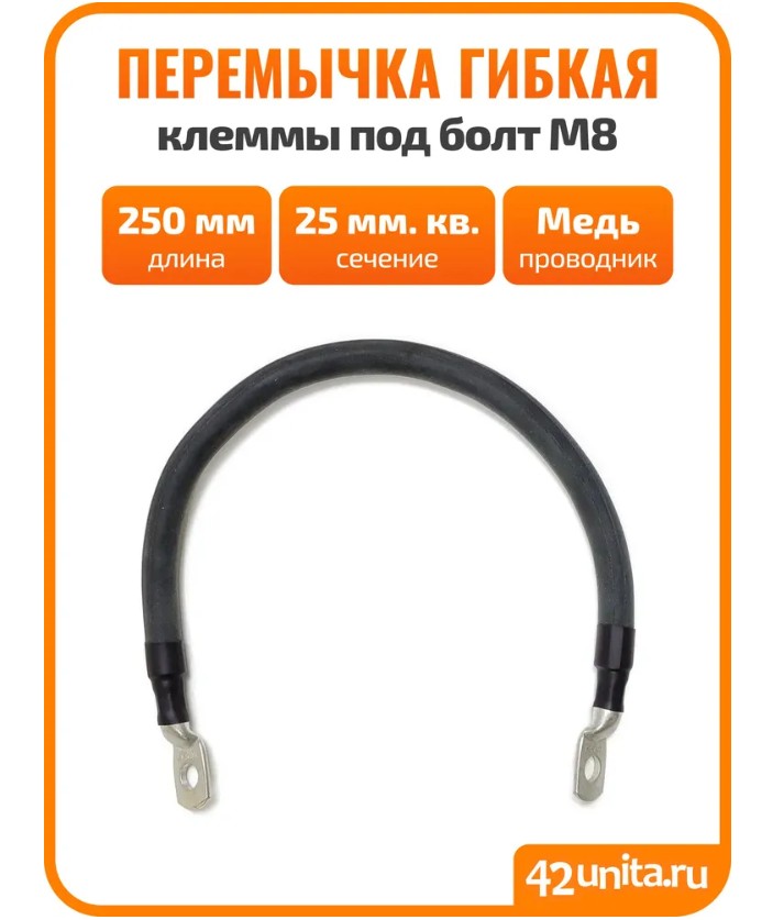 Перемычка гибкая S-25-8-250 изготовлены из изолированного медного кабеля сечением 25 мм.кв. Применяются для последовательного и параллельного соединения аккумуляторных батарей и подключения их к инверторам и источникам бесперебойного питания.