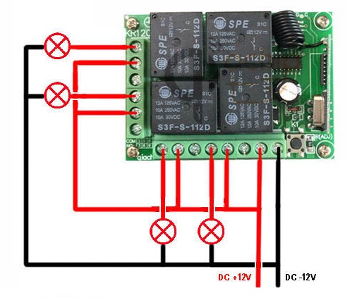 • Все 4 кнопки в режиме переключателя. Необходимо нажать 3 раза на кнопку на плате приёмника. Дождаться пока светодиод загорится постоянно. Затем нажать на любую кнопку на пульте.