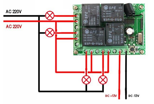 • 2 кнопки в режиме переключатель и 2 кнопки в режиме коммутации. Необходимо нажать 6 раз на кнопку на плате приёмника. Дождаться пока светодиод загорится постоянно. Затем нажать на любую кнопку на пульте.