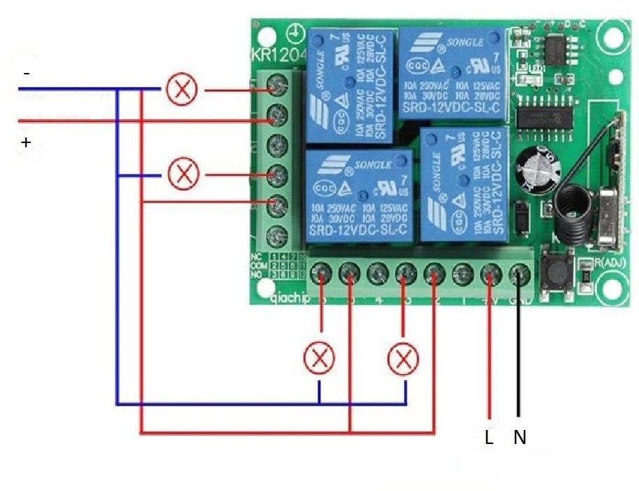 • 2 кнопки в режиме переключатель и 2 кнопки в режиме коммутации. Необходимо нажать 6 раз на кнопку на плате приёмника. Дождаться пока светодиод загорится постоянно. Затем нажать на любую кнопку на пульте.