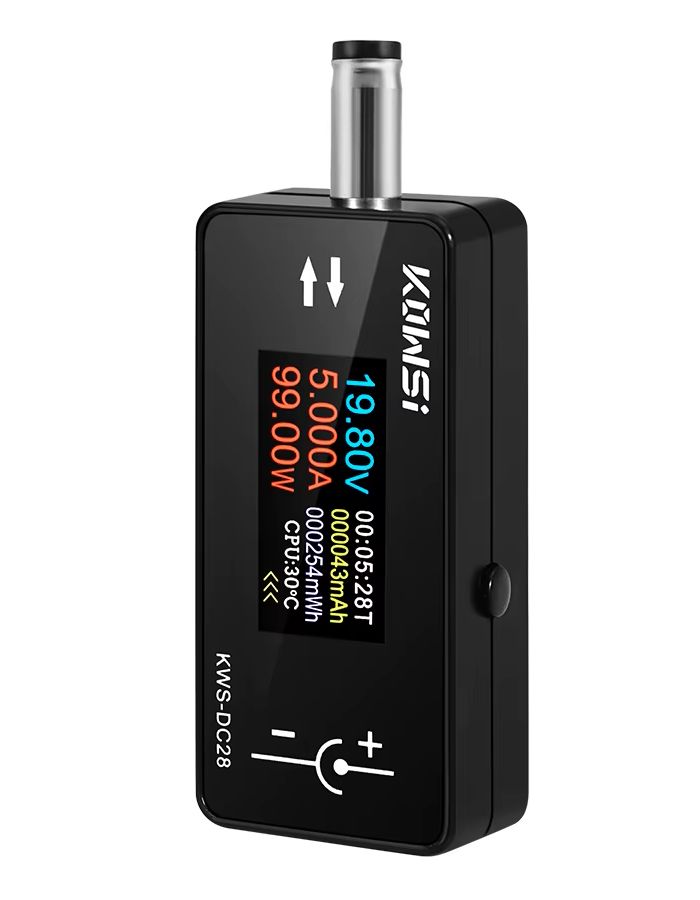 Тестер KWS-DC28 позволяет контролировать эффективность зарядных устройств и оценивать остаточную ёмкость аккумуляторов устройств, заряжаемых через DC-интерфейс DC 5.5 x 2.1 мм.