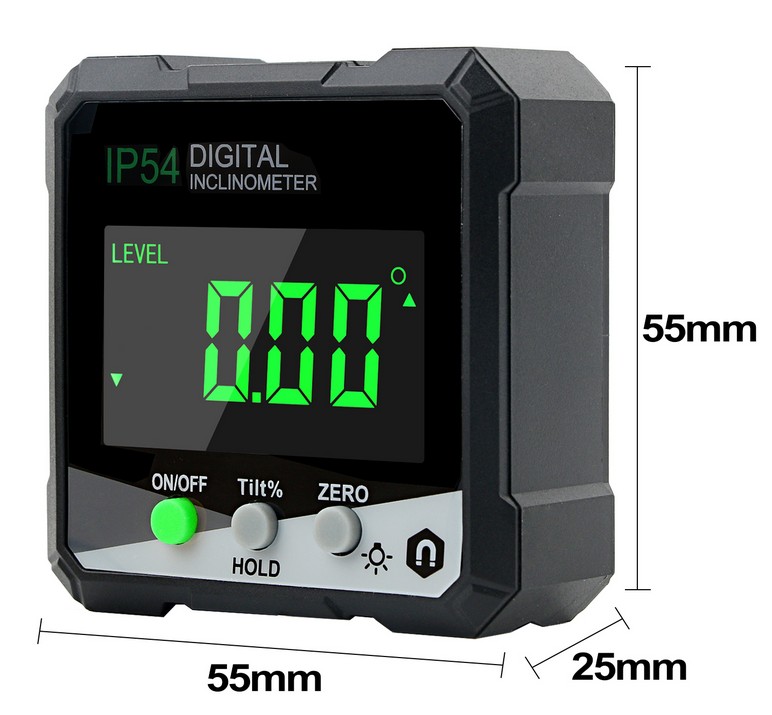 Угломер (инклинометр) электронный, магнитный RZ838-GRE станет полезным инструментом для людей, занимающихся слесарными, столярными, строительными работами. С его помощью можно быстро и точно определить угол наклона горизонтальной или вертикальной поверхности, что будет важно, например, при изготовлении мебели, установке направляющих для гипсокартонных конструкций и т.п. Электронный угломер может измерять угол наклона любой из 4-х боковых своих сторон. Питание осуществляется от двух батареек типа 3ААА . Информация отображается на LCD дисплее с подсветкой . Для установки и надежной фиксации на металлических поверхностях угломер оснащен магнитным держателем находящимся в нижней части корпуса устройства.