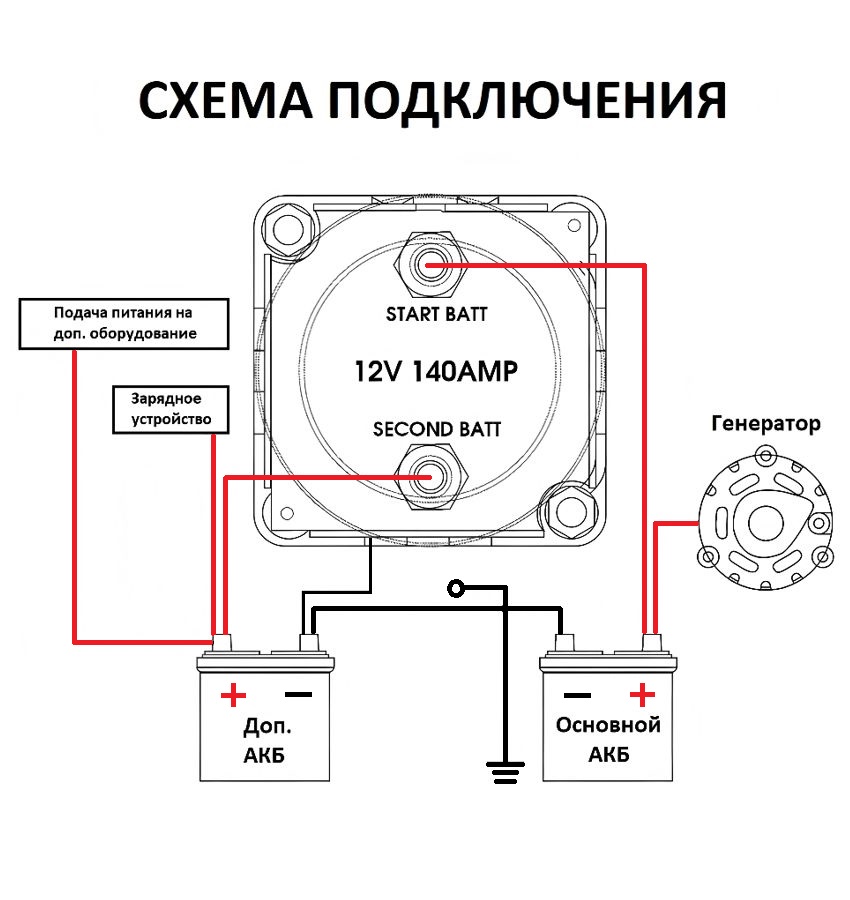 • Устройство предназначено для гальванической развязки основного (штатного) и дополнительно установленного второго (дополнительного) аккумуляторов. Основной аккумулятор используется только для запуска двигателя, все остальные электропотребители питаются от дополнительного аккумулятора.