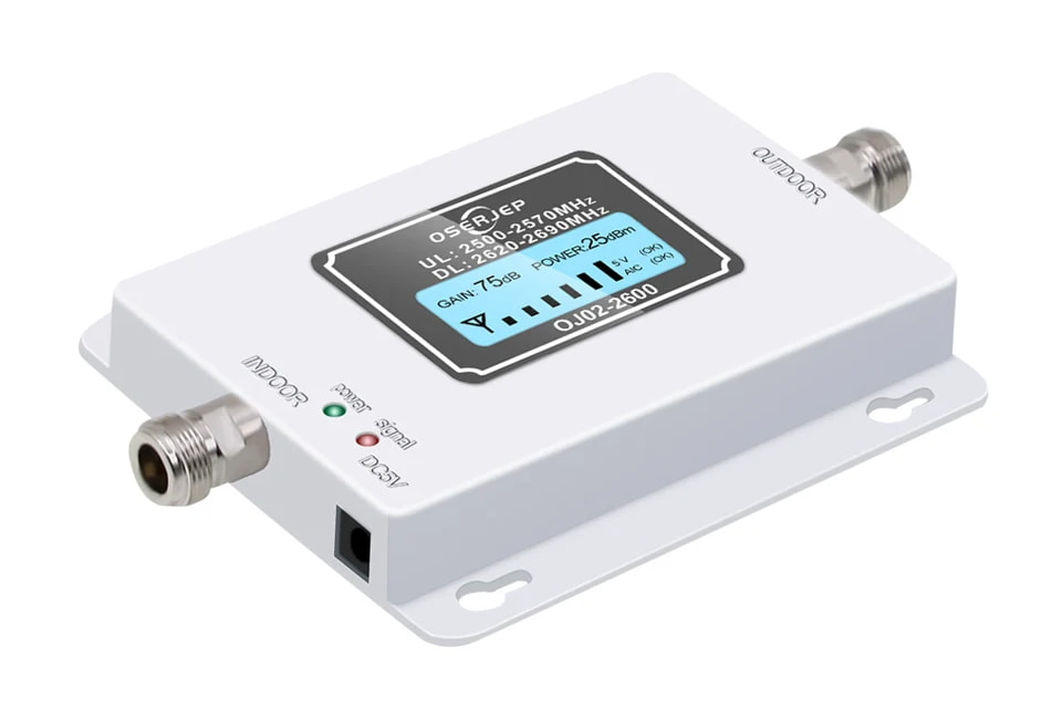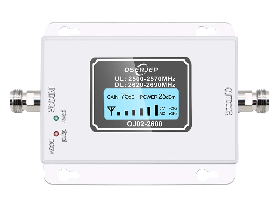 Повторитель Oserjep OJ02-2600 4G-сигнала c частотой 2600 МГц сотовой сети LTE 2600 предназначен для улучшения сотового покрытия в местах, изолированных от передающих антенн (базовых станций) операторов сотовой связи.