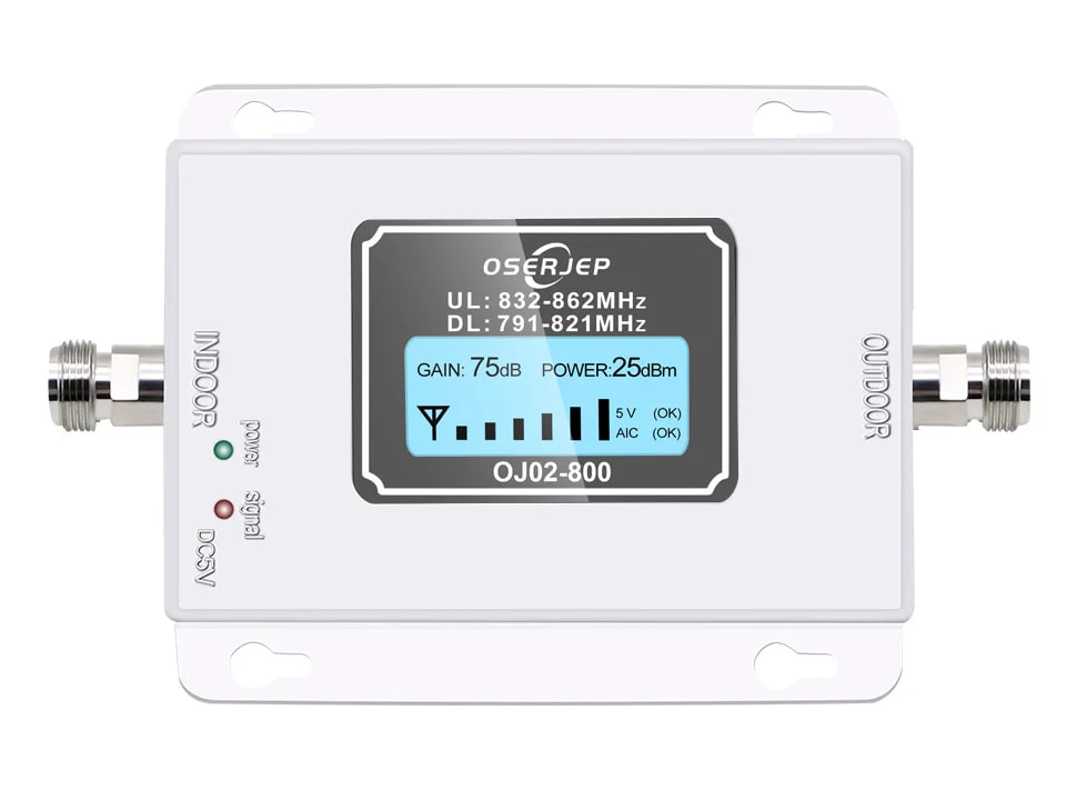 Повторитель Oserjep OJ02-800 4G-сигнала c частотой 800 МГц сотовой сети LTE band 20 предназначен для улучшения сотового покрытия в местах, изолированных от передающих антенн (базовых станций) операторов сотовой связи.