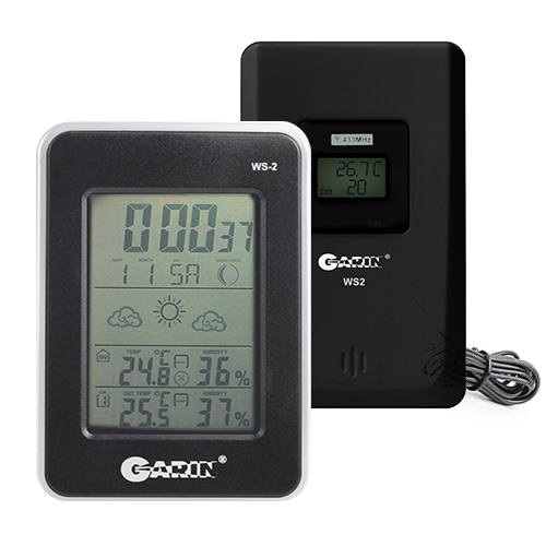 GARIN WS-2 – это современная простая многофункциональная погодная станция, предназначенная для отображения времени, календаря, лунных фаз, температуры и относительной влажности в помещении и на улице. Внешний датчик размещается вне помещения и передает данные по беспроводному каналу, что облегчит процесс его установки и избавит от необходимости держать всё время окно открытым или сверлить стену.