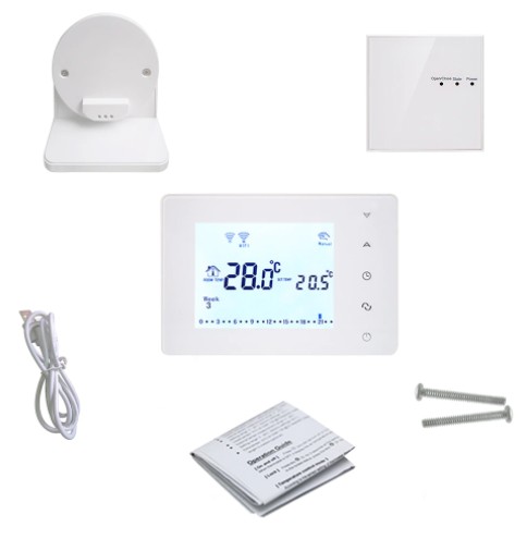Комплект содержит беспроводной программируемый регулятор температуры (термостат) для установки желаемого климата в жилом помещении и беспроводной приемник для непосредственного подключения к котлу отопления или другому отопительному оборудованию.