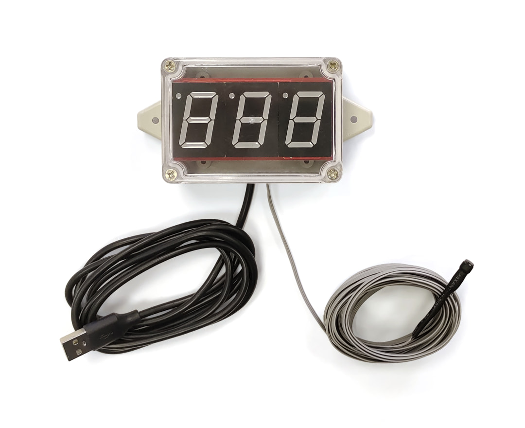 Состоит из модуля индикации с большим дисплеем для отображения температуры, с внешним цифровым термодатчиком, подключенным к модулю длинным кабелем. Применяется для измерения температуры в сауне, бане, теплице итд. Термодатчик устанавливается внутри прогреваемого помещения, а блок индикации выносится в помещение предбанника на проводе на расстояние длинны кабеля. Изоляция провода термодатчика изготовлена из качественного ПВХ, и устойчива к высоким температурам до 100°C включительно, и не боится низких температур.