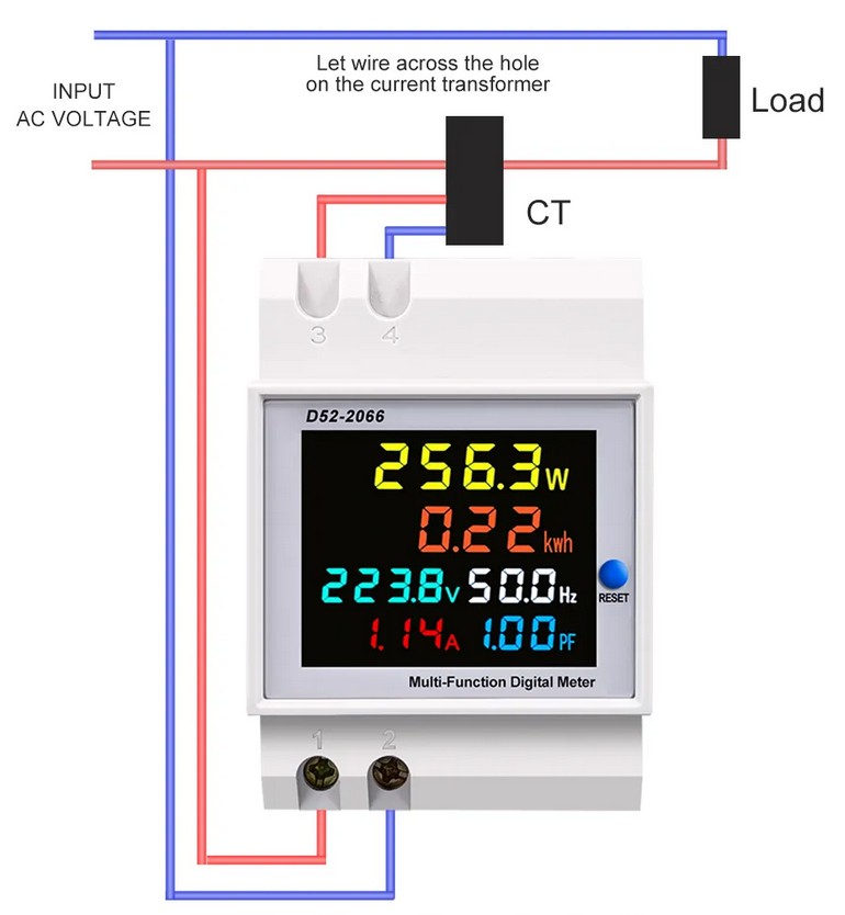 Цифровой мультиметр TOMZN D52-2066HD на DIN-рейку с внешним измерительным трансформатором тока.
