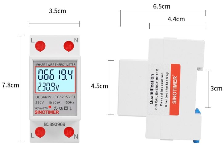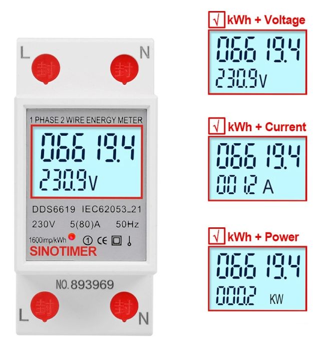 Цифровой ваттметр, вольт-амперметр и электросчетчик на DIN-рейку 230В, 80А Sinotimer DDS6619-004