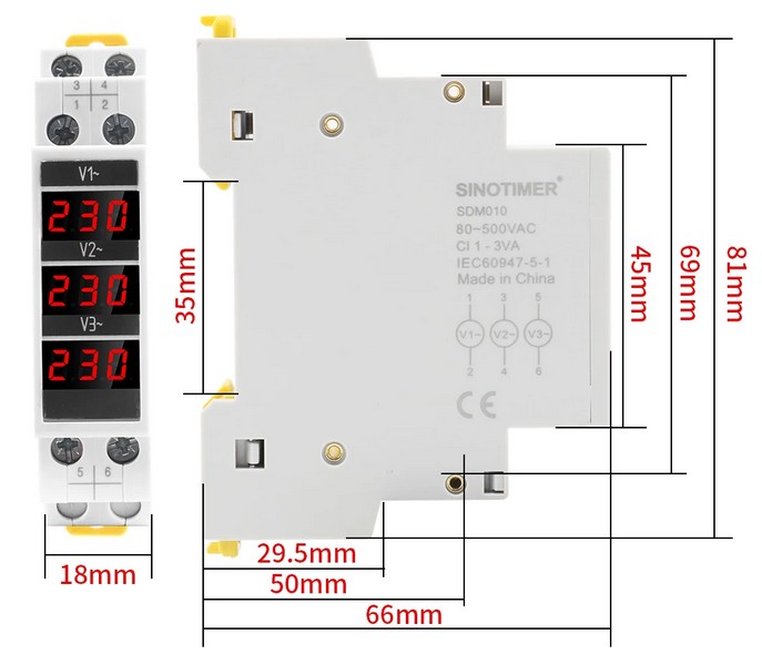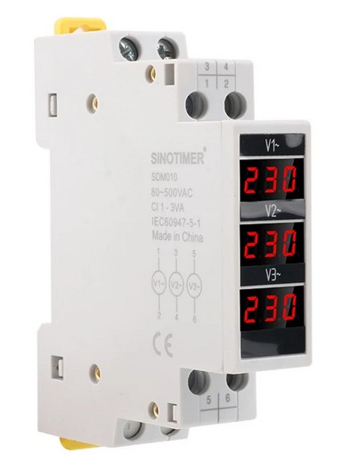 Цифровой вольтметр (3-х фазный) Sinotimer на DIN-рейку 80В-500В SDM-010