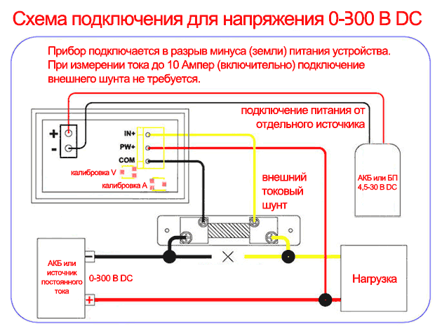 Встроенный шунт! Внимание, цвет провода, подключаемого к "минусу" нагрузки IN+ (желтый на схеме) может отличаться!