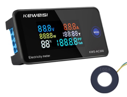 Встраиваемый вольтметр, амперметр, ваттметр, счетчик электроэнергии с функцией сброса и учетом cosφ, термометр, KWS-AC300 с индуктивным датчиком тока.