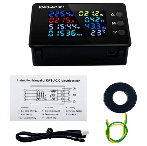 Встраиваемый вольтметр, амперметр, ваттметр, счетчик электроэнергии с функцией сброса и учетом cosφ, термометр, KWS-AC301 с функцией звуковой сигнализации и индуктивным датчиком тока.