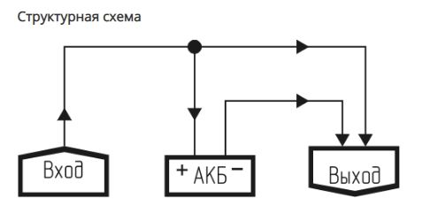 Свинцово-кислотный аккумулятор 12 В. Емкость аккумулятора необходимо подбирать исходя из мощности подключаемой нагрузки и продолжительности возможных перебоев питания. Аккумулятор подключается к клеммам "АКБ+" и "АКБ-" (АКБ). Устройство, которое обеспечивается бесперебойным питанием постоянным током (далее “Нагрузка”), подключается к клеммам "OUT+" и "OUT-" (Выход).