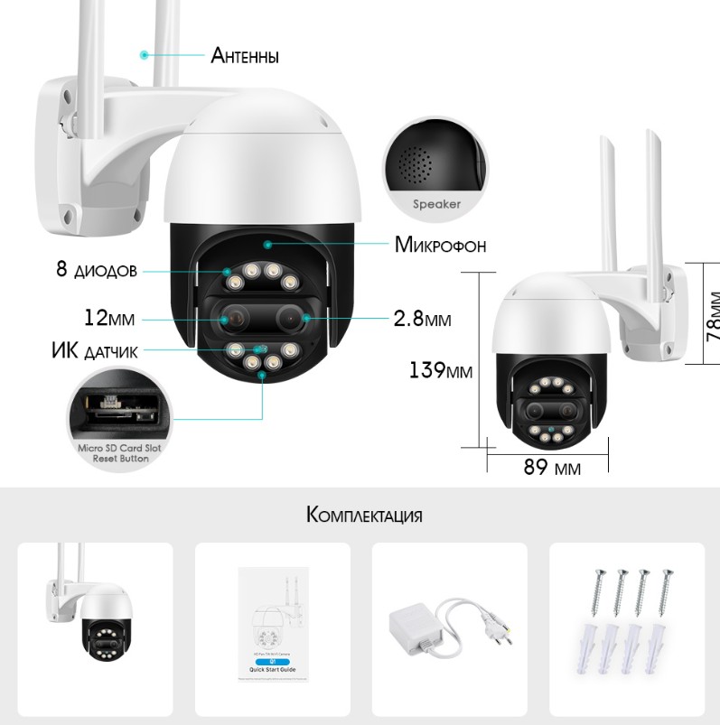 Комплектация камера, крепежные болты, блок питания 12В, инструкция на Английском