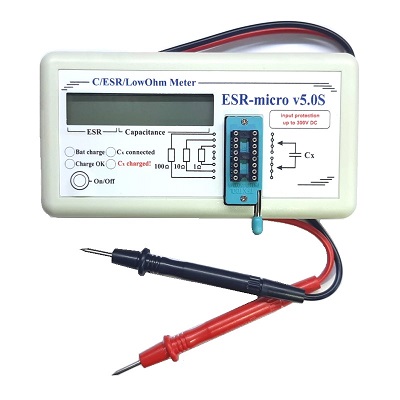 Пришедшие на смену приборам «ESR-micro v4.0s» и «ESR-micro v4.0SI» новинки «ESR-micro v5.0S» и «ESR-micro v5.0S+» предназначены для измерения ёмкости и ESR (Equivalent Series Resistance) электролитических конденсаторов без демонтажа их из печатной платы, что в значительной степени уменьшает время поиска неисправности, повышает качественные показатели ремонта аппаратуры.