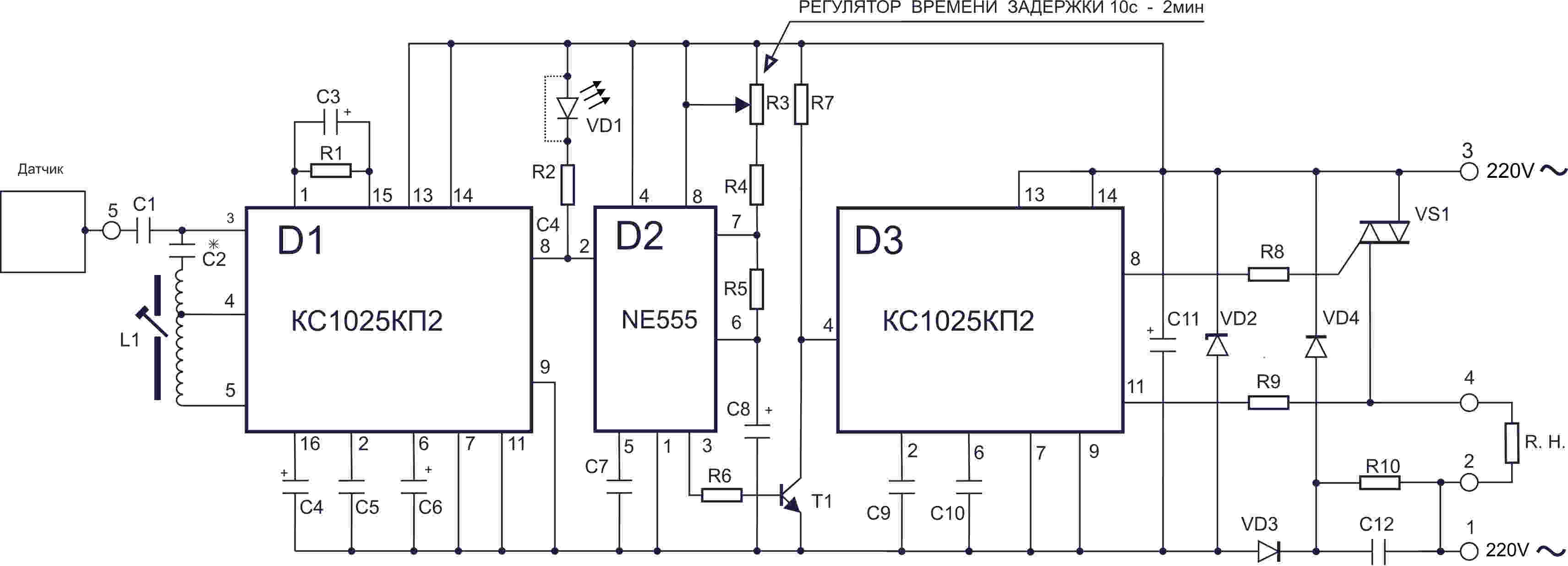 Реле собрано на 3-х микросхемах - на микросхеме D1 выполнен блок ёмкостного реле, на D2 собран таймер задержки, микросхема D3 управляет силовым симистором VS1. D1 и D3 являются специализированными микросхемами КС1025КП2, которая имеет полный набор необходимых компонентов для построения ёмкостного реле: генератор синусоидальных колебаний, детекторы синусоидальных колебаний, источник опорного напряжения, дифференциальный усилитель, стабилизатор напряжения, пороговая схема, схема защиты, схема управления симистором.