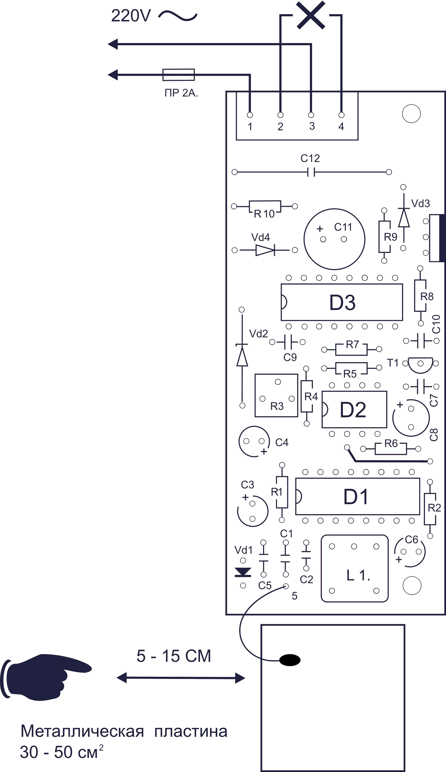 Ёмкостное реле с триггером - прибор, реагирующий на изменение ёмкости датчика, при приближении человека, металлических предметов, жидкости. В данной схеме встроен таймер, позволяющий осуществлять отключение реле с задержкой, регулируемой в широких пределах, с помощью подстроечного резистора. Устройство содержит небольшое количество компонентов для сборки и налаживания - имеет два регулировочных элемента. Однако, несмотря на простоту сборки не подходит для начинающих и юных радиолюбителей, так как не имеет гальванической развязки от сети. В качестве датчика, к собранной плате через обрезок провода подключается кусочек фольгированного текстолита (прилагается в наборе), либо металлическая пластина, либо металлическая сетка (имеет максимальную чувствительность, при возможных максимальных габаритах).