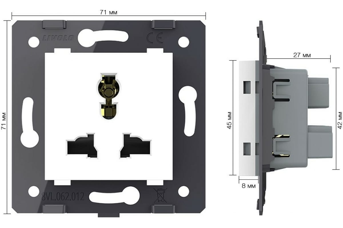 Розетка электрическая универсальная с заземлением защитными шторками Livolo, цвет белый (механизм)