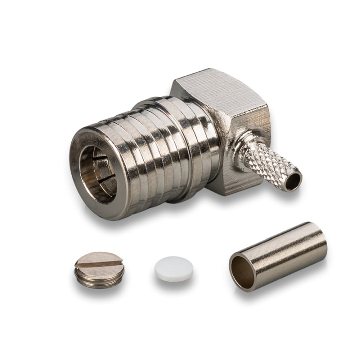 Радиочастотный разъем (штекер) QMA-типа под пайку (жила) и обжим (оплетка) с угловым подводом кабеля типоразмера RG-174 / RG-316. Обычно устанавливается со стороны соединителей (на кабельные сборки). Разъемы типа QMA это современная альтернатива разъемам типа SMA, отличающаяся быстрым цанговым соединением. Номинальное волновое сопротивление — 50 Ом.