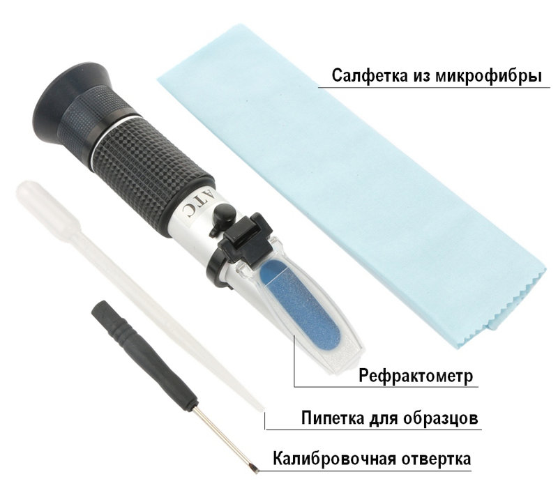 Рефрактометр оснащен автоматической компенсацией температуры (диапазон компенсации от 10 до 30 °C), а для каллибровки предусмотрен специальный винт. В комплекте пипетка для взятия пробы, отвертка для калибровки, микрофибра для очистки оптических поверхностей, инструкция и пластиковый чехол.