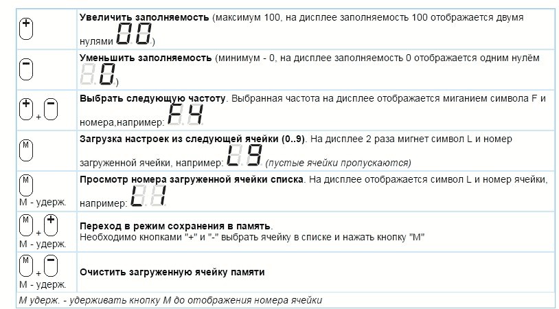 Текущие настройки ШИМ (частота, заполняемость) автоматически сохраняются в ячейку автосохранения при отсутствии нажатий на кнопки ~10 секунд. При включении ШИМ-контроллер включается с настройками автосохранения.