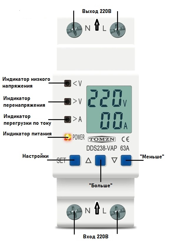 Реле контроля напряжения и тока TOMZN DDS238-VAP 80A (вход снизу)