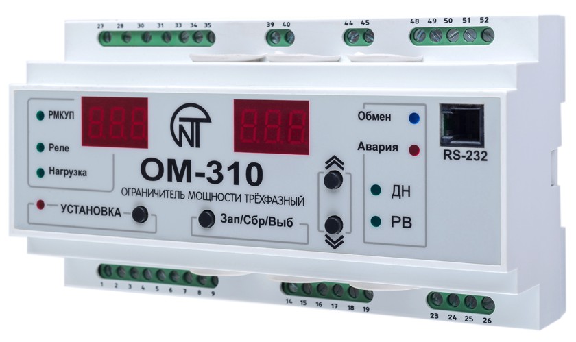 Предназначено для защиты, отключения нагрузки при превышении порога мощности, индикации параметров электросети, оповещения об аварии, дистанционного управления. Ограничитель мощности ОМ-310 предназначен для: