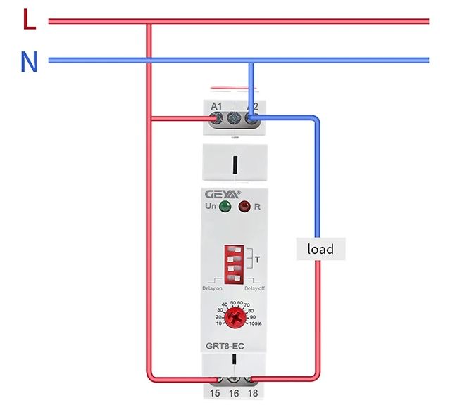 • Delay ON: задержка включения T после подачи питания (контакты перебрасываются после задержки);