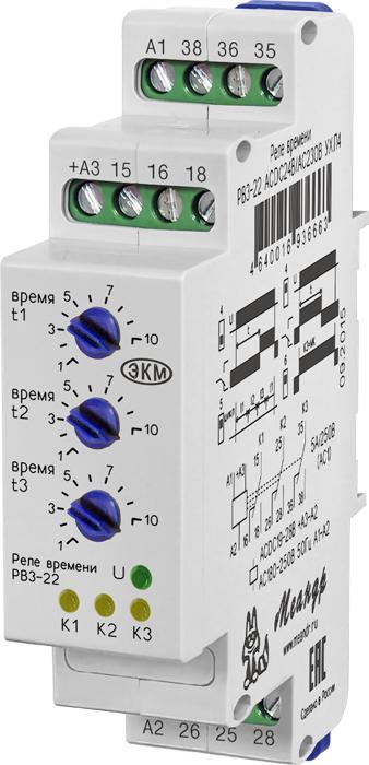 Реле времени трёхцепное РВ3-22 с выдержкой в каждой цепи, предназначено для коммутации электрических цепей (до трёх независимых цепей К1, К2, К3) с предварительно установленными выдержками времени t1, t2 и t3 для применения в схемах автоматики как комплектующее изделие. Реле можно использовать взамен реле ВЛ-56, ВС-43 и др.