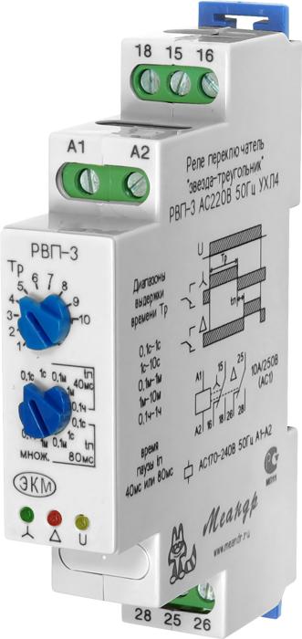 Реле времени пусковое РВП-3 предназначено для обеспечения плавного пуска мощных трёхфазных асинхронных электродвигателей, а также для уменьшения пусковых токов при включении двигателей. Уменьшение пусковых токов позволяет использовать в цепи пуска двигателя автоматы защиты на меньший ток срабатывания, что повышает надёжность защиты двигателя при перегрузках или аварии электропитания.
