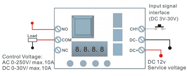 Напряжение/ток на контактах реле (NO/COM) AC 0~250V / макс. 10A; DC 0~30V / макс. 10A
