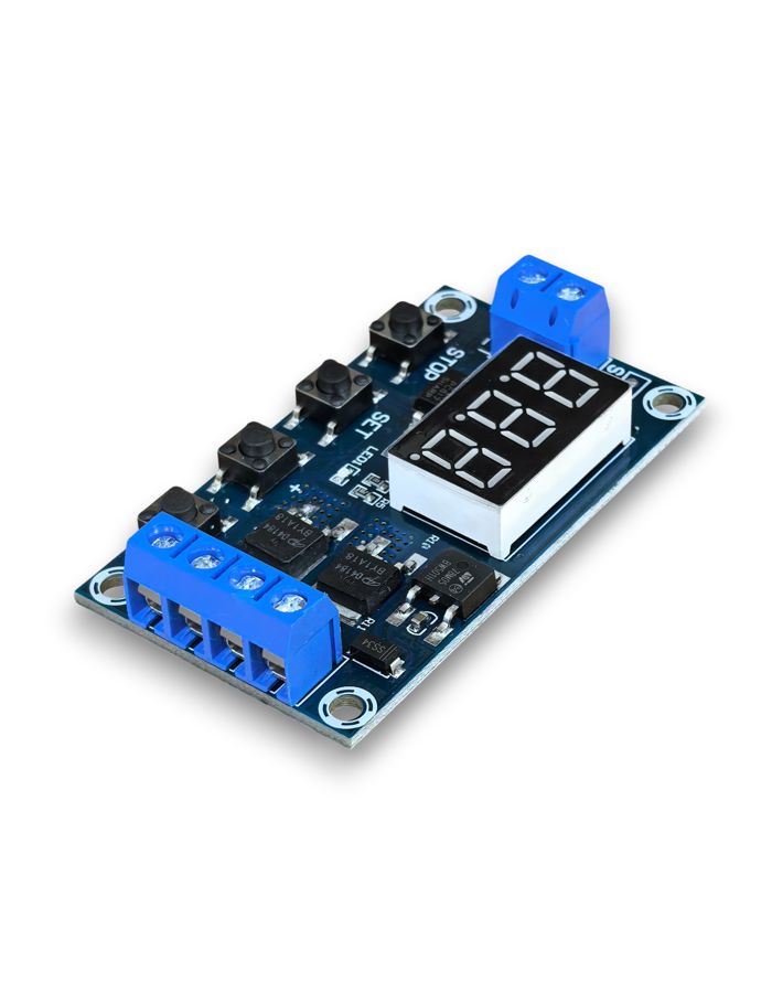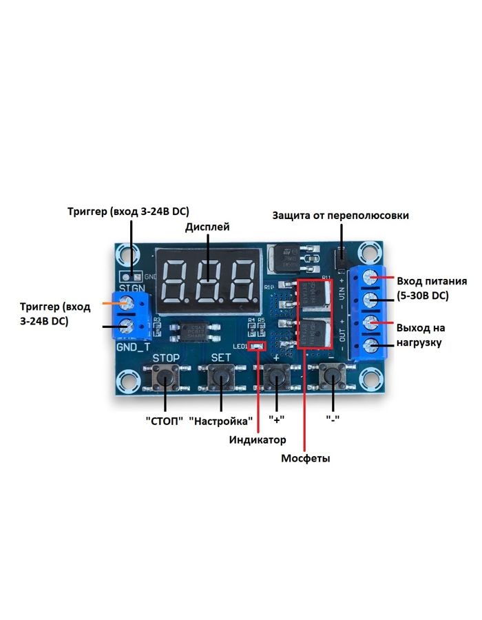 Программируемый таймер времени (0-999 мин), LED- индикатор, транзисторный выход на полевых транзисторах. Вход запуска таймера внешним сигналом с гальванической развязкой. Выход: 1 канал ( два параллельно включенных N - канальных полевых транзистора).