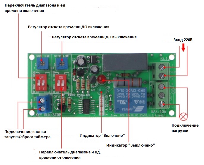 Потенциометром RUN TIME установите необходимый диапазон отсчета до запуска реле.