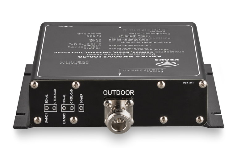 Усилитель сотового сигнала RK900/2100-50 производства НПК Крокс решает проблемы с приёмом сигнала GSM900 (EGSM, EDGE) и UMTS2100 (3G, HSPA, HSPA+) мобильными телефонами (модемами и прочими абонентскими устройствами). Репитер использовать эту модель в автомобилях и небольших помещениях площадью до 100 м2 при достаточном уровне входного сигнала.
