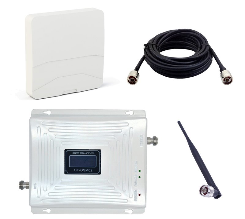 Входящий в комплект репитер Орбита OT-GSM02 позволяет создать или улучшить возможность приема сотовых телефонов и модемов в таких местах как подземные гаражи, изолированные металлические ангары, загородные дома, садовые участки.  Репитер имеет достаточное усиление и выходную мощность, поэтому рекомендуется для улучшения приема на площадях до 200 м2.