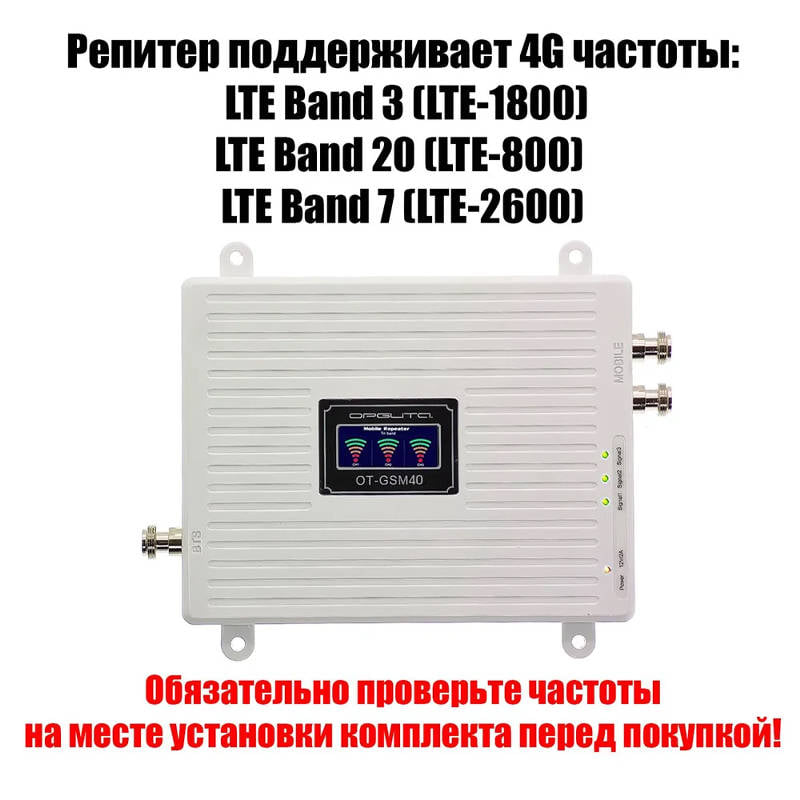 Комплект для усиления сигналов Орбита OT-GSM40 диапазонов сотовой сети LTE band 20 (800 МГц), band 3 (1800 МГц) и band 7 (2600 МГц) и 2G — GSM1800 предназначен для улучшения сотового покрытия в местах, изолированных от передающих антенн (базовых станций) операторов сотовой связи.