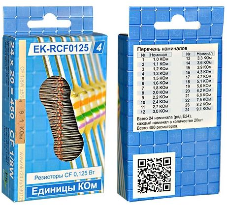 Набор выводных резисторов (единицы КОм), 24 номинала, каждого по 20 резисторов EK-RCF0125/4