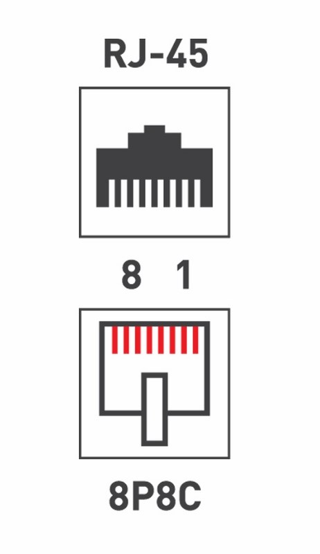 Устройство оснащено гнездом RJ- 45 категории 5е под разъем 8P8C (8 посадочных мест и 8 контактов). Кабель фиксируется с помощью зажимных контактов.