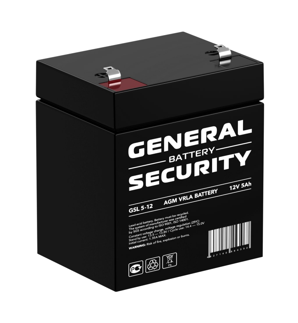 Аккумуляторные батареи GENERAL SECURITY серии GSL5-12  – необслуживаемые (выполненные по AGM–технологии) батареи общего применения, имеют небольшие массогабаритные показатели; способны работать в циклическом режиме; герметизированы – не требуют долива воды; безопасны в эксплуатации; имеют низкий уровень саморазряда; высоконадежны.   Предназначены для обеспечения резервным питанием систем охраны и пожарной безопасности, телекоммуникационного оборудования и связи, промышленных объектов широкого назначения, работы в ИБП (UPS).