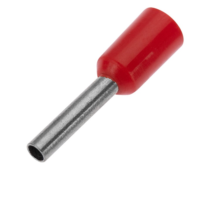 НАКОНЕЧНИК ШТЫРЕВОЙ ВТУЛОЧНЫЙ изолированный (НШВИ  F-8мм)  1мм²  (E1008, СЕ010008red)  красный  REXANT   предназначен для создания быстрого и качественного подключения различного электрооборудования и монтажа электросетей. Такой современный способ подготовки кабеля к соединению заменяет процесс облуживания или скрутки многожильных медных проводов, формируя целостностное окончание кабеля с последующим подключением промышленного или бытового электрооборудования. Втулочный наконечник состоит из латуни, с поверхностным электролитическим лужением, и рассчитан на монтаж одного проводника с соответствующим сечением под опрессовку. Предварительно зачищенная жила заводится внутрь латунной втулки, и обжимается специальными пресс-клещами (HT-864   арт.12-3202, 12-3202-4; HT-866   арт.12-3205; HT8 6-4   арт.12-3106; HT-301E   арт.12-3113, 12-3114, 12-3013) в считанные секунды. Для удобства заведения многожильного провода внутрь латунной втулки предусмотрена манжета конической формы, изготовленная из поливинилхлорида (ПВХ), обеспечивающая надежную защиту соединения от влаги и других внешних воздействий.