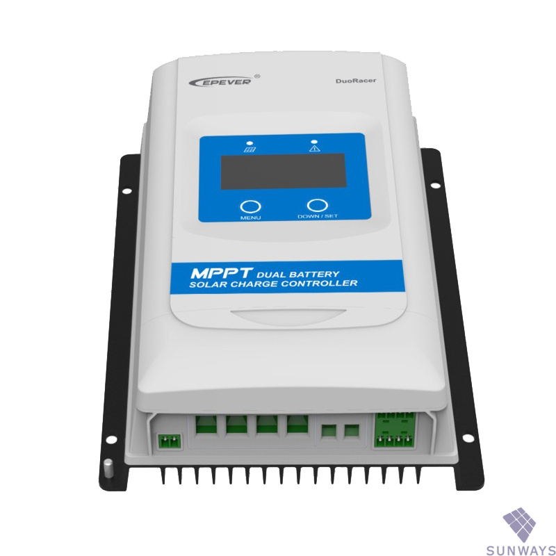 Epever DuoRacer — серия контроллеров, которая специально разработана для солнечных энергосистем в составе катеров, яхт и автодомов. Контроллер имеет с два независимыми выхода на заряд аккумуляторных батарей любого типа (AGM, GEL, Carbon, LifePO4). Два независимых выхода на АКБ позволяют заряжать по отдельности сервисные и стартерные АКБ в системе, даже, если они имеют разный тип и емкость!  Контроллеры заряда Epever DR (Duo Racer) получили обновлённый функционал, дизайн и повышенный класс защиты от влаги и пыли IP33. Контроллеры DR (Duo Racer) имеют обновленное программное обеспечение с поддержкой литий ионных аккумуляторных батарей c функцией защиты батареи при заряде в минусовые температуры. Обновленная элементная база и программное обеспечение позволили повысить КПД преобразования солнечной энергии до 99,5%! В сравнении с дешевыми аналогами на основе PWM технологии, новое поколение MPPT контроллеров DR (Duo Racer генерирует до 30% больше энергии за световой день. Новая серия контроллеров выпускается в трех версиях на 10, 20 и 30А мощности. Выносной монитор MT-11 (Опционально) наглядно позволяет отслеживать состояние системы. Расширенный функционал, полный набор электронных защит, высококачественная элементная база и невысокая цена, оставляют аналоги конкурентных брендов далеко позади. Новые контроллеры DR (Duo Racer) – это лучшее решение для построения солнечных энергосистем на борту яхты, катера или автодома!