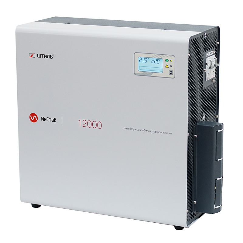 Инверторный стабилизатор напряжения "Штиль" мощностью 12000 ВА / 10000 Вт выполнен в виде блока для настольного или настенного размещения со светодиодами индикации, выключателем сети и двумя розетками евростандарта на передней панели и автоматическим предохранителем на задней. Для подключения к сети имеется кабель с вилкой евростандарта.