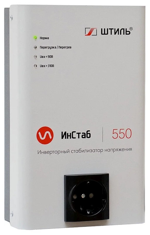 Инверторный стабилизатор напряжения "Штиль" мощностью 550 ВА / 400 Вт выполнен в виде блока для настольного или настенного размещения со светодиодной индикацией на передней панели, клавишным выключателем, сетевым шнуром с евровилкой и двумя розетками евростандарта на передней панели.
