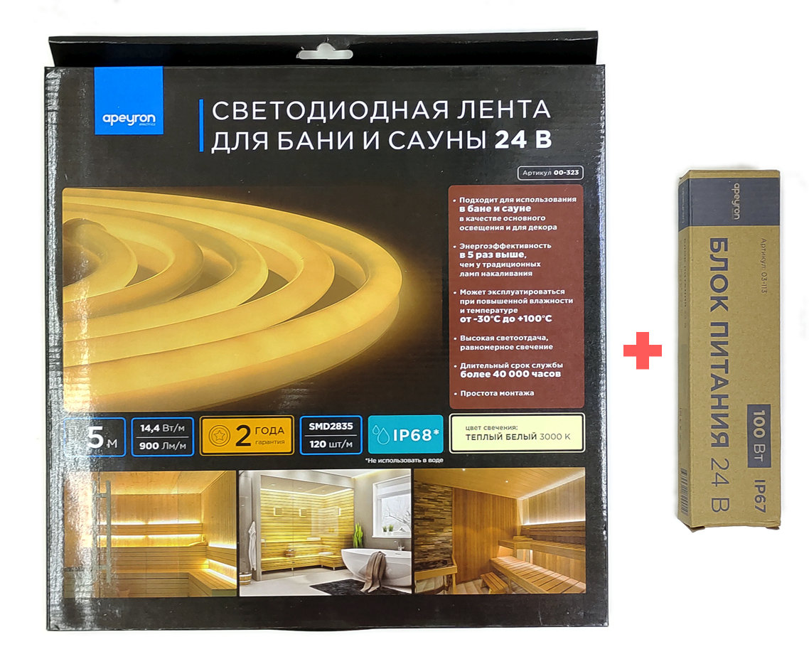 Светодиодная лента для сауны Apeyron 00-323 (IP68) с влагостойким блоком питания 03-113 (IP67) Комплект