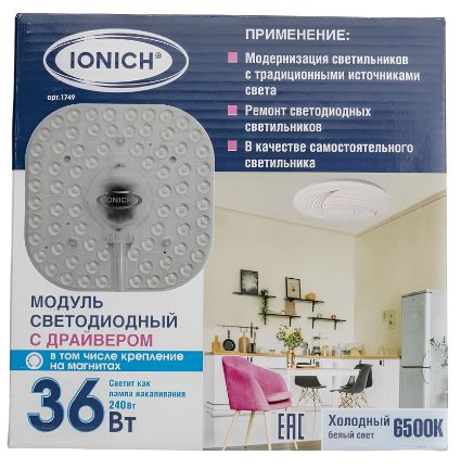 Светодиодный модуль IONICH для декоративных светильников 36 Вт 2880 Лм 230 В 6500 К 190x190 мм IP20 со встроенным драйвером предназначен для замены стандартных ламп, а также современных светодиодных источников света, которые уже повсеместно используются в настенно-потолочных светильниках.