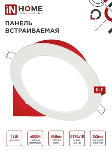 Панель светодиодная встраиваемая круглая RLP 12Вт 230В 4000К 840Лм 170мм белая IP40 IN HOME